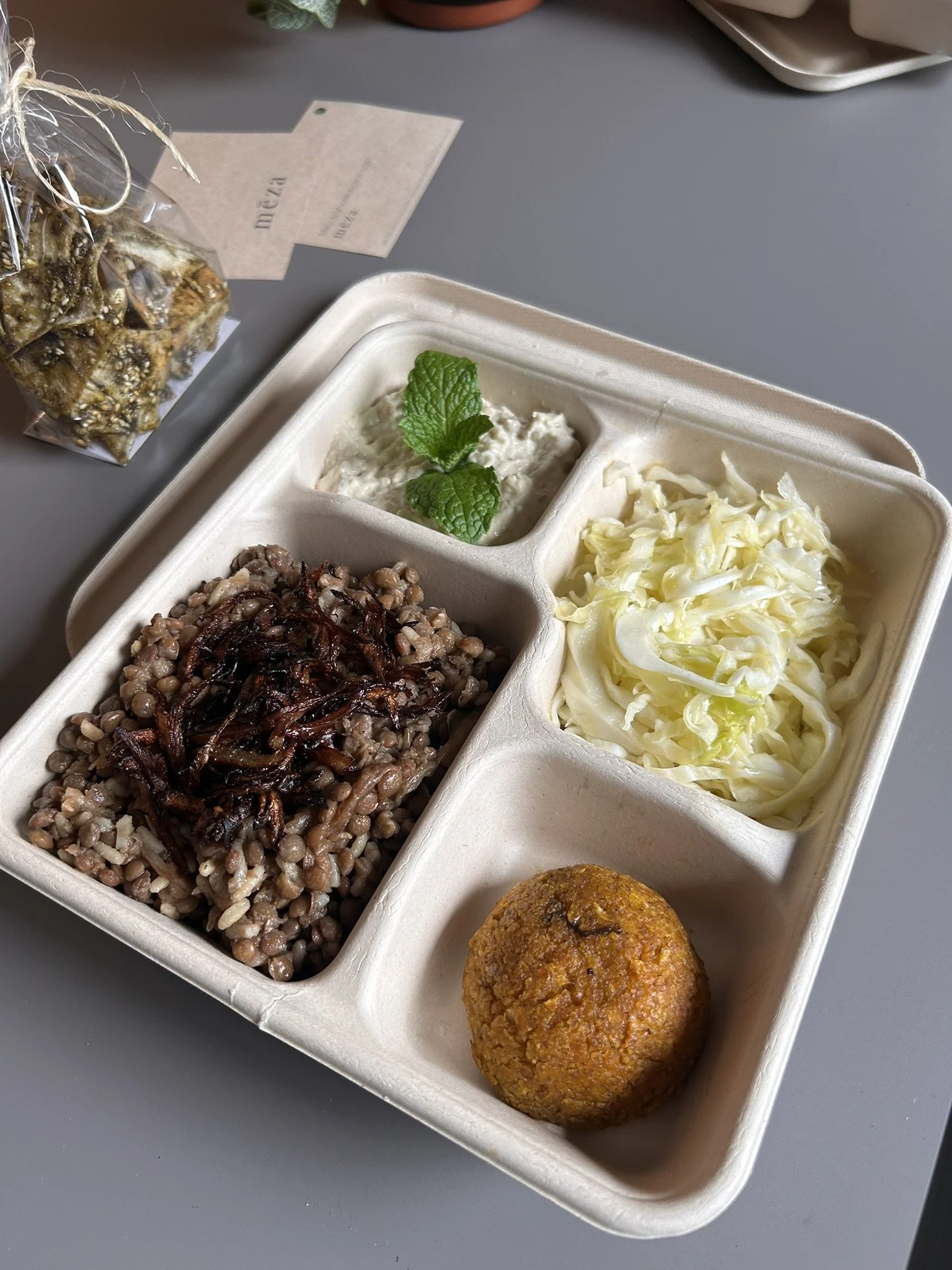 Mélange de riz, lentilles et oignons. Accompagnée d’une salade de choux citronnée.